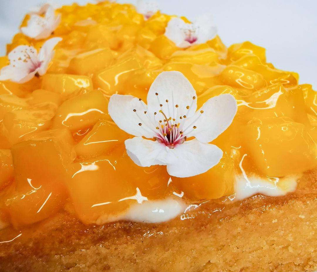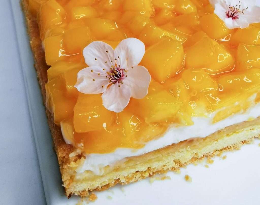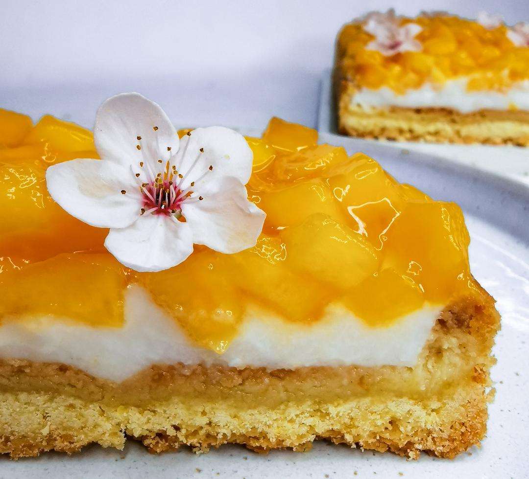 Nel frattempo sbuccia i mango e riducili in piccoli cubetti. Amalgama la gelatina con lo zucchero e l’acqua e porta a bollore. Una volta pronta aspetta qualche istante. Nel frattempo riempi il guscio di frolla con la crema al cocco.