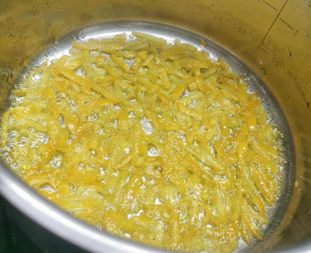 Aggiungi 30 gr di zucchero e 100 ml di acqua. Porta bollore a fiamma dolce e aspetta che l’acqua sia completamente evaporata. Ci vorranno circa 5 minuti. Quando le scorzette risulteranno traslucide e asciutte falle raffreddare.