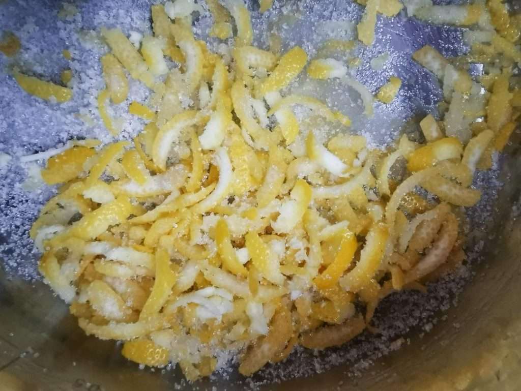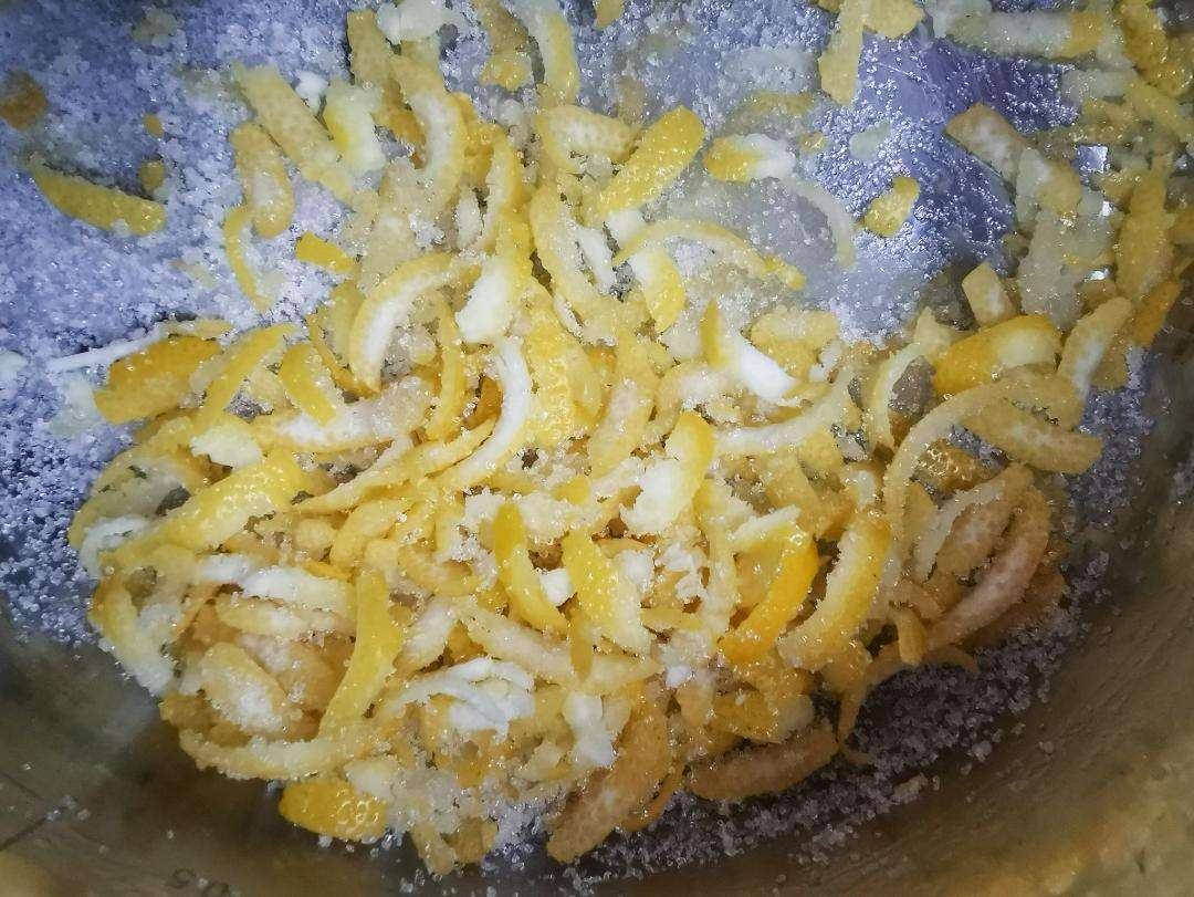 Prepara il limone candito da aggiungere alla frolla grattugiando a julienne o sminuzzando finemente la scorza dei limoni in un pentolino.