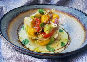 Ingredienti per 2 persone: 4 filetti di orata abbattuti 1 piccolo avocado 2 pesche gialle mature 60 ml d’olio evo 2 arance da spremuta 150