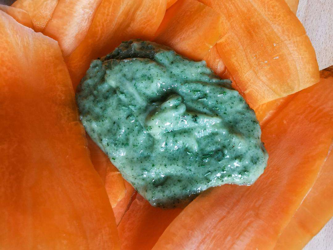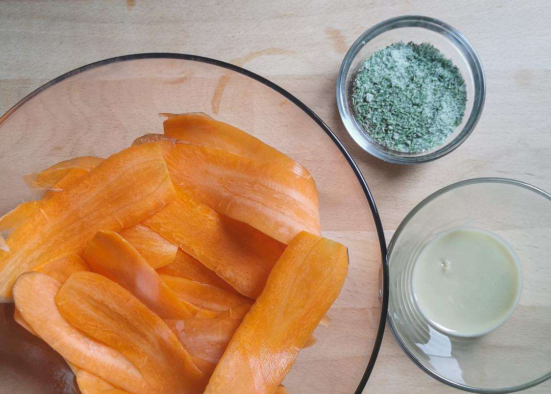 Trasferisci le fette di carote in un recipiente capiente e distribuisci la crema sulla loro superficie aiutandoti con le mani perchè il risultato sia più possibile uniforme.
