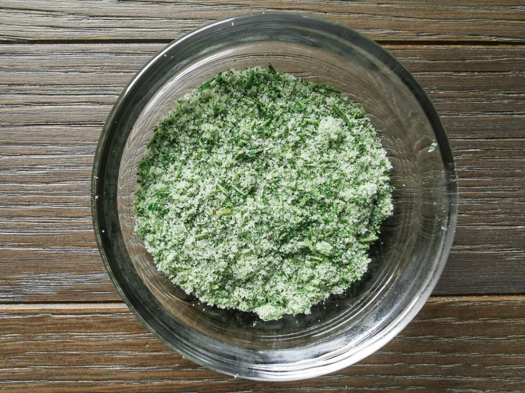 Nel mentre frulla il sale grosso con abbondante rosmarino fresco. Consiglio di farne sempre un pò sia per la bontà di questo sale sulle pietanze, sia per facilitare il lavoro della lama del frullatore. Se ne fai una quantità ridotta rischi che la lama non faccia bene il suo lavoro e il sale al rosmarino rimanga troppo grossolano!