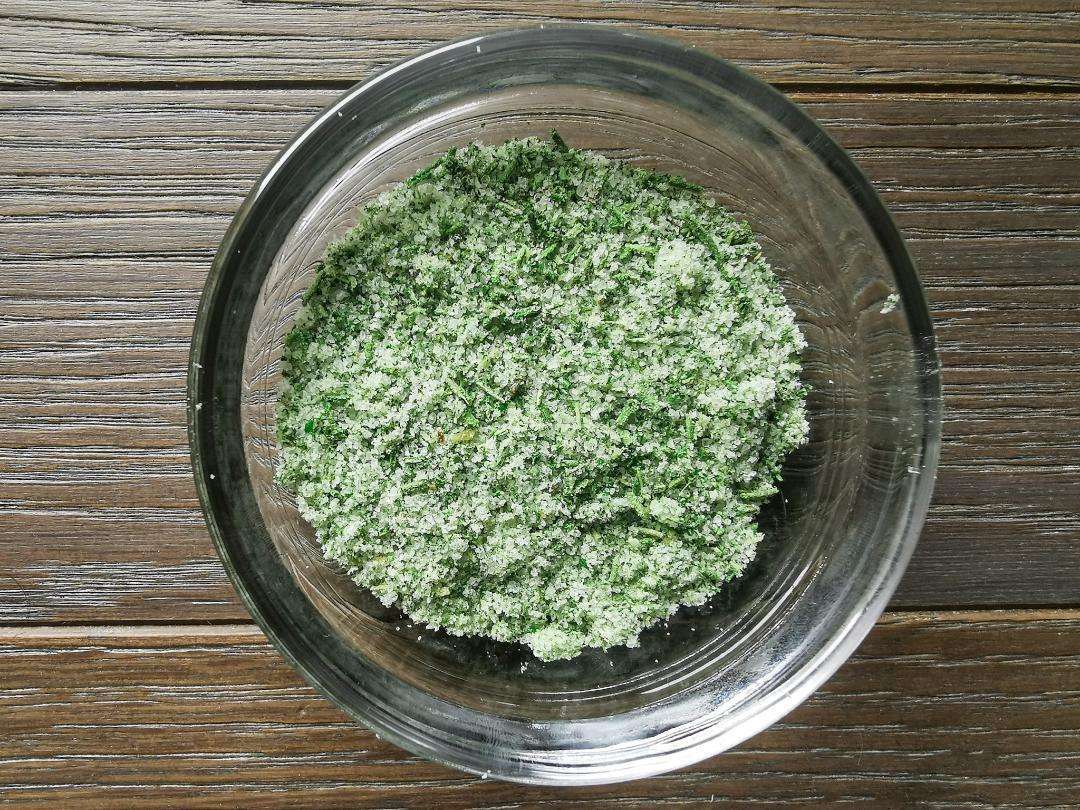 Amalgama un cucchiaino di sale al rosmarino con la crema di mandorle e lo zucchero di canna fino ad ottenere una crema densa ed omogenea.