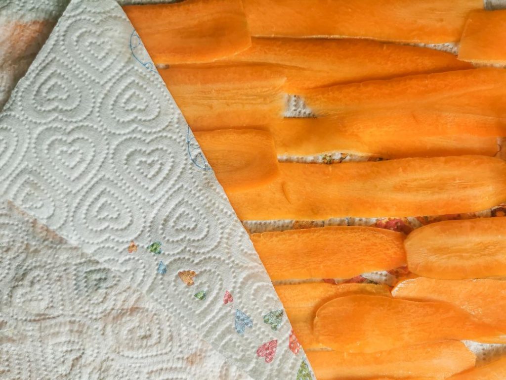 Lava le carote, privale dell’estremità superiore e affettala sottilmente con la mandolina. cospargi le fette di carota con un paio di pizzichi di sale e stendile su carta assorbente per almeno 20 minuti per rimuovere l’acqua in eccesso.