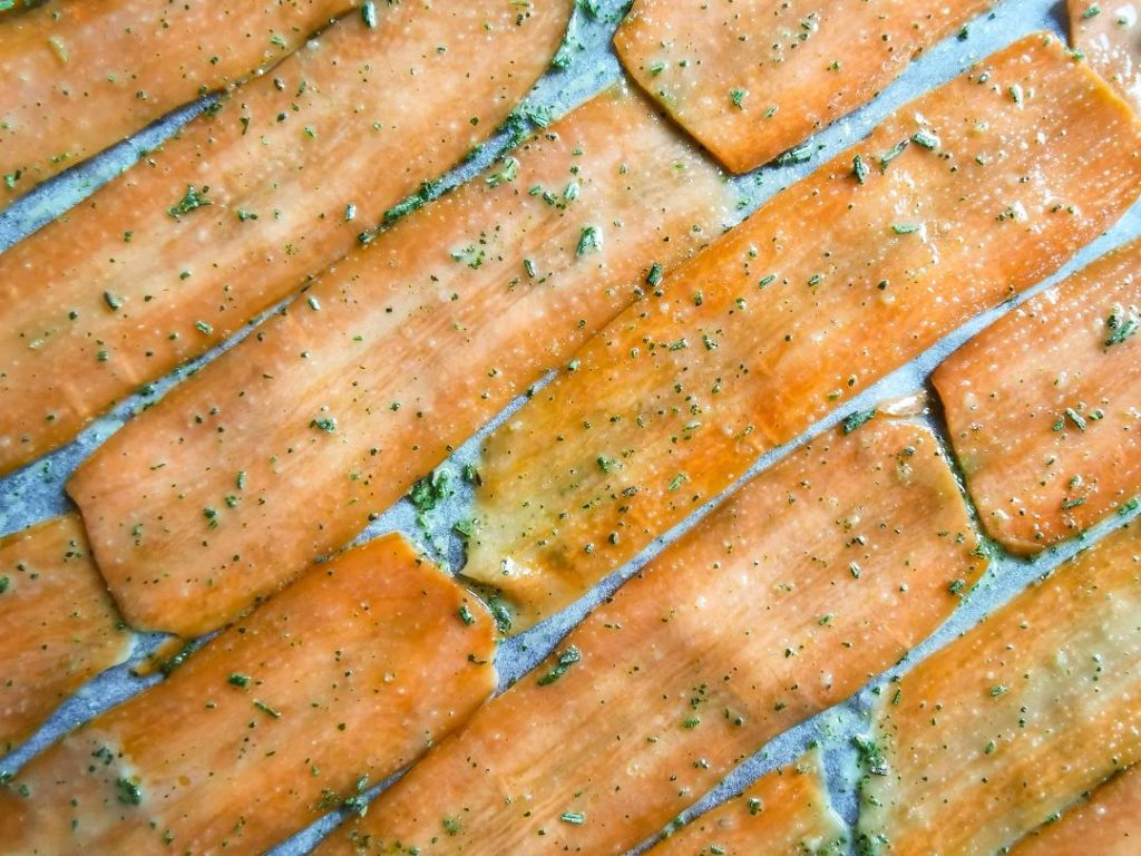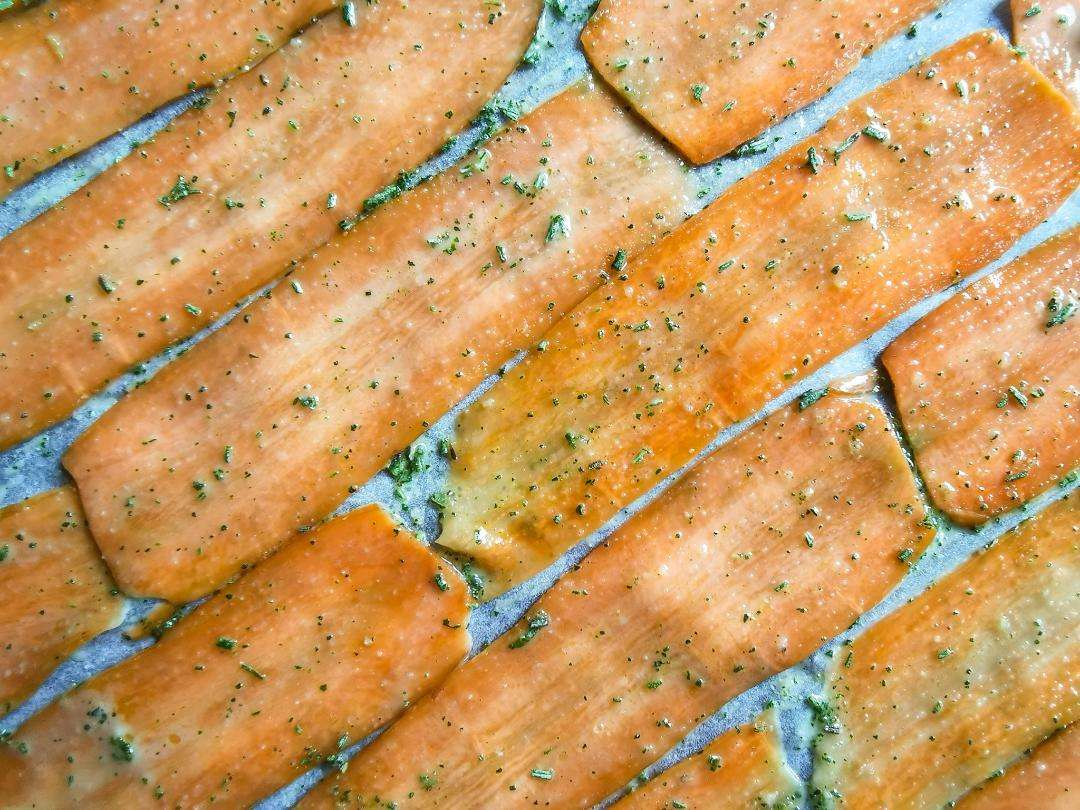 Rivesti una placca con carta forno e stendi le fette ci carote cercando di non sovrapporle. In questo modo la cottura sarà più possibile uniforme e più facilmente gestibile.