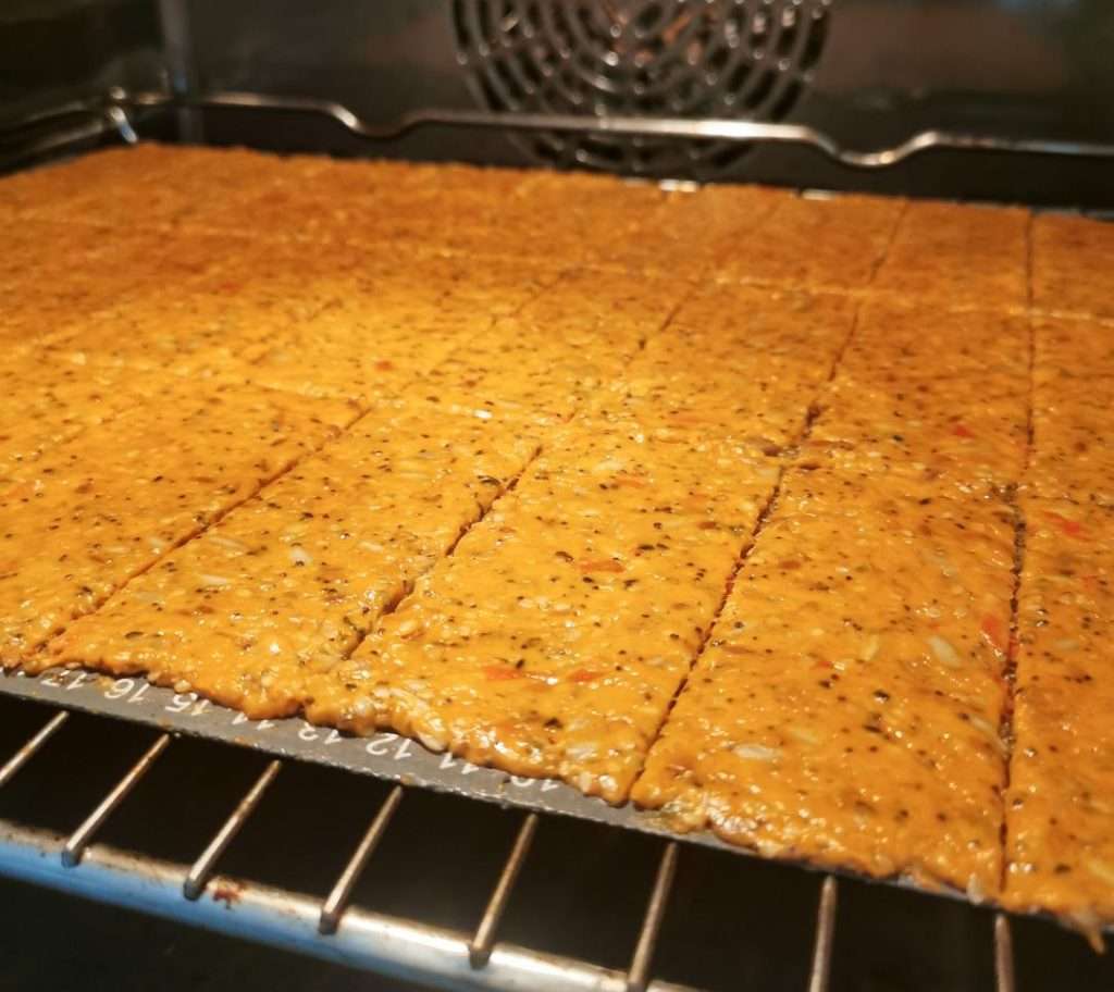 Accendi il forno a 190°. Trasferisci il composto su un foglio di carta forno leggermente unto d’olio, Copri con un altro foglio di carta forno leggermente unto e stendi il composto più sottile possibile tra i due fogli con l’aiuto del mattarello. Ti consiglio di ottenere uno spessore più uniforme possibile perché anche la cottura sia uniforme.