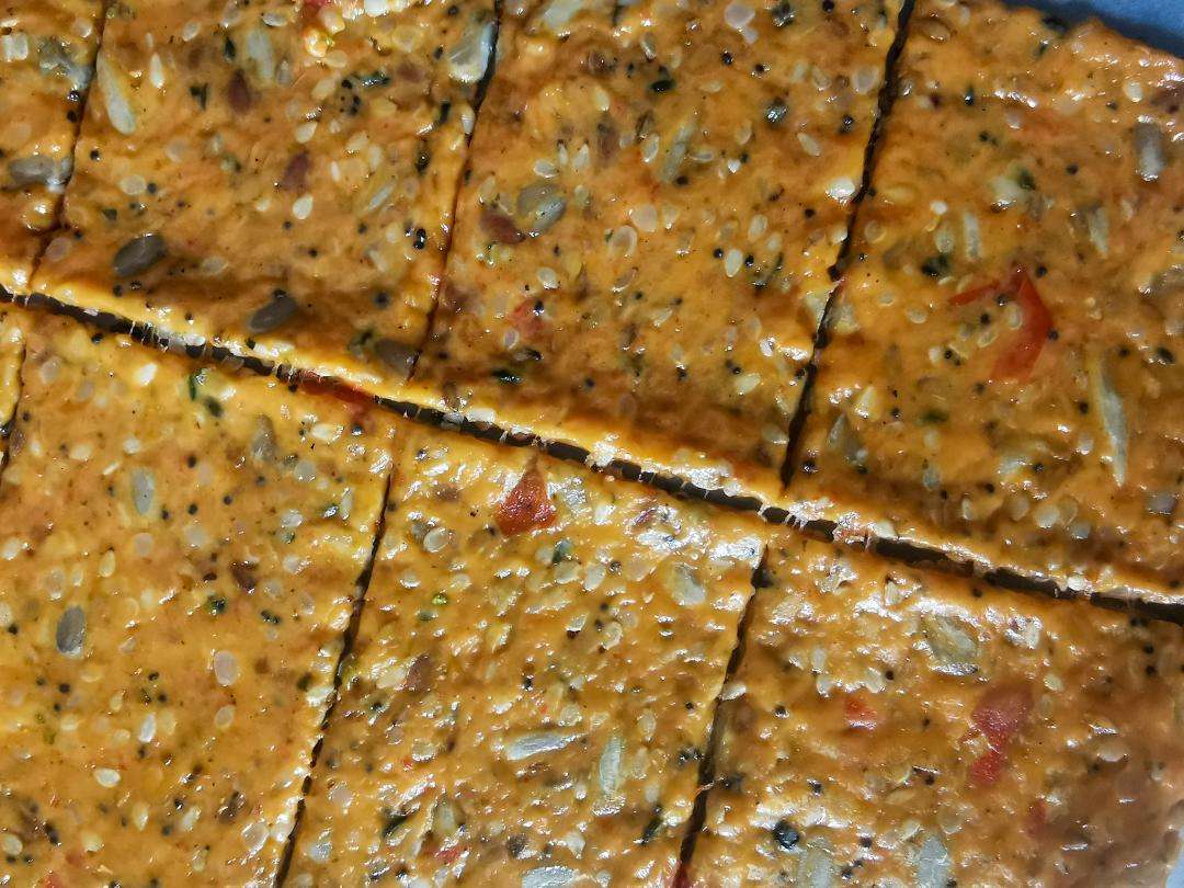 Rimuovi la carta poggiata sopra la sfoglia e forma i cracker con l’aiuto di una rotella per pizza tagliando dei rettangoli con un gesto deciso. Evita di usare il coltello perché strapperebbe la sfoglia in prossimità dei semi.