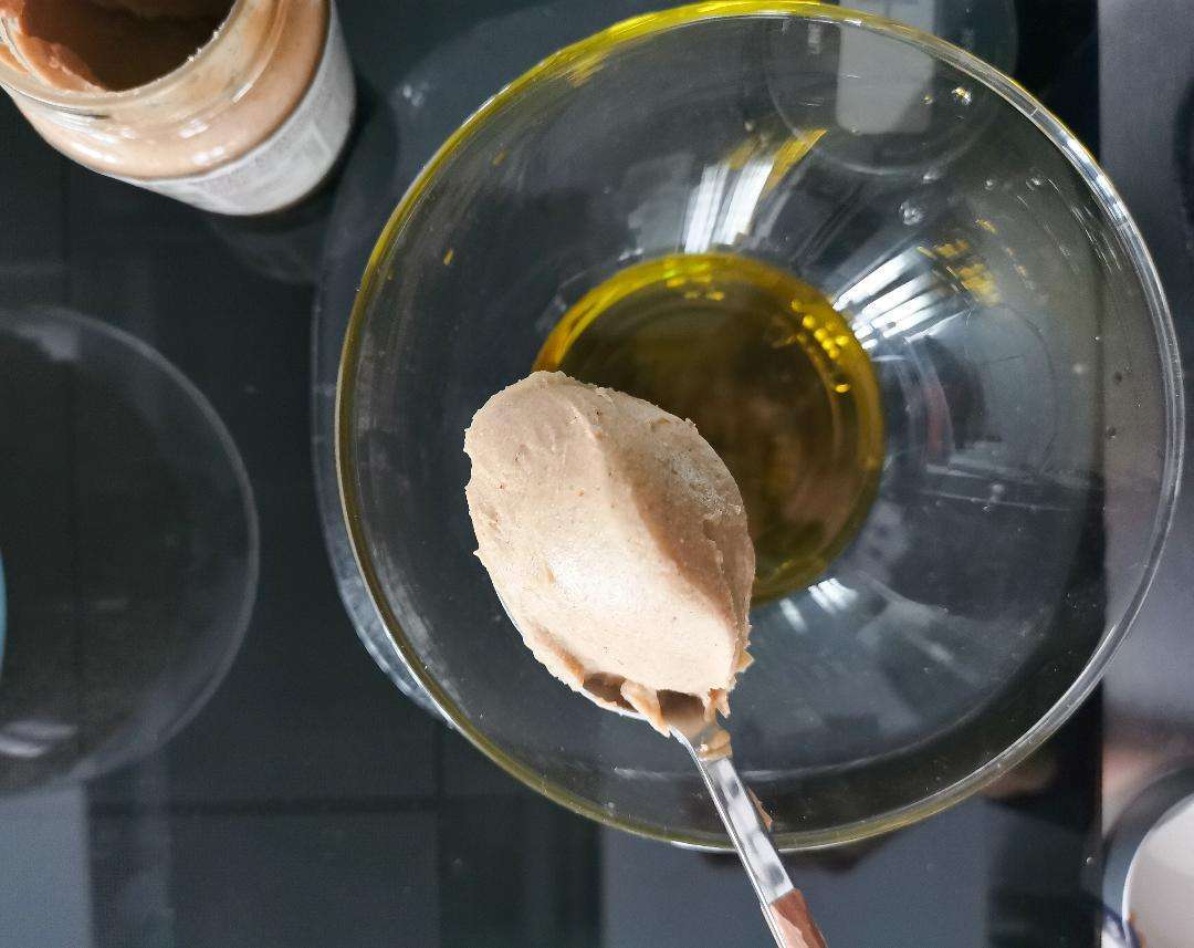 Versa in una ciotola l’olio d’oliva, la crema di mandorle, l’albume, la salsa di solia e il sale. Amalgama il tutto fino ad ottenere una crema omogenea.