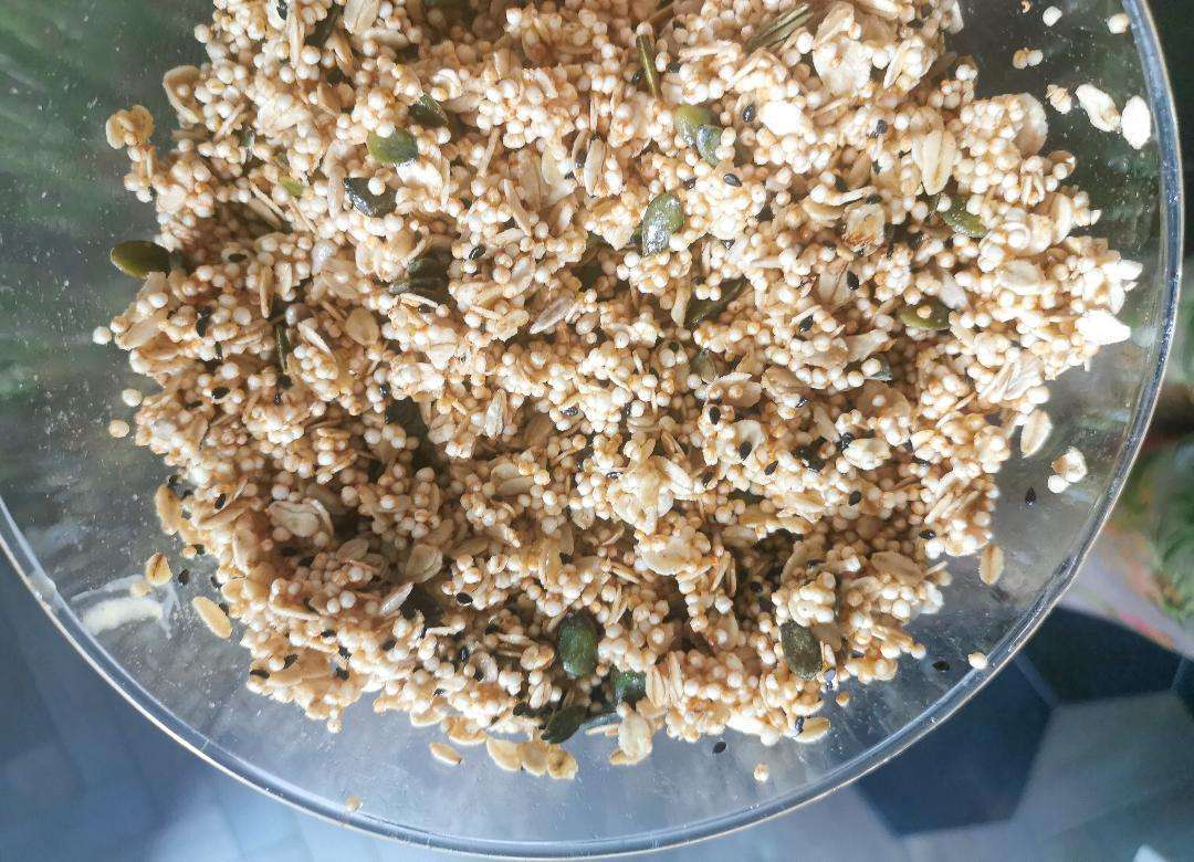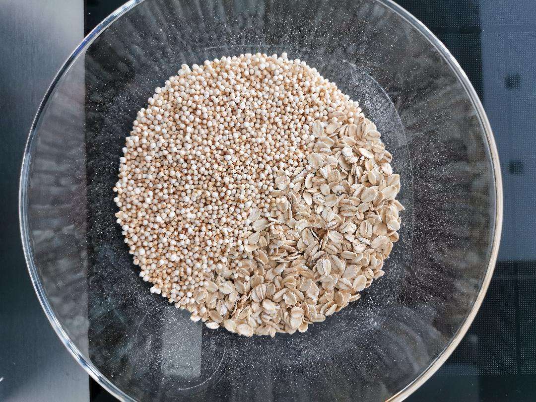 Versa in un’altra ciotola capiente i fiocchi d’avena e la quinoa soffiata.