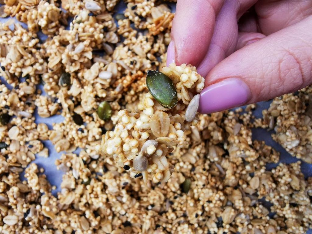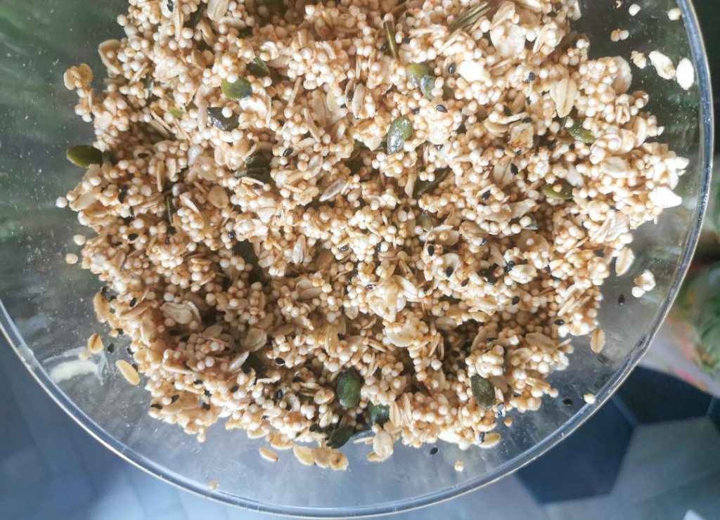 Da qui nasce l’idea di creare una versione salata della granola. Una ricetta sana e golosissima perfetta per essere aggiunta a un bel piatto di minestra fumante o da mangiare con un hummus, un purè o ancora per dare una marcia in più a un insalatona rendendola piatto unico!!
