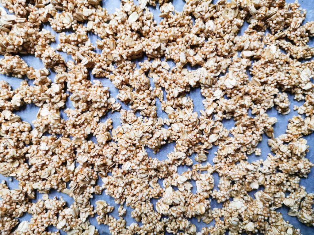 Inforna a 130° per circa 25 minuti. A metà cottura apri il forno e mescola delicatamente con un cucchiaio in modo che la granola sul perimetro (che tende a cuocere prima) venga portata verso il centro della placca.