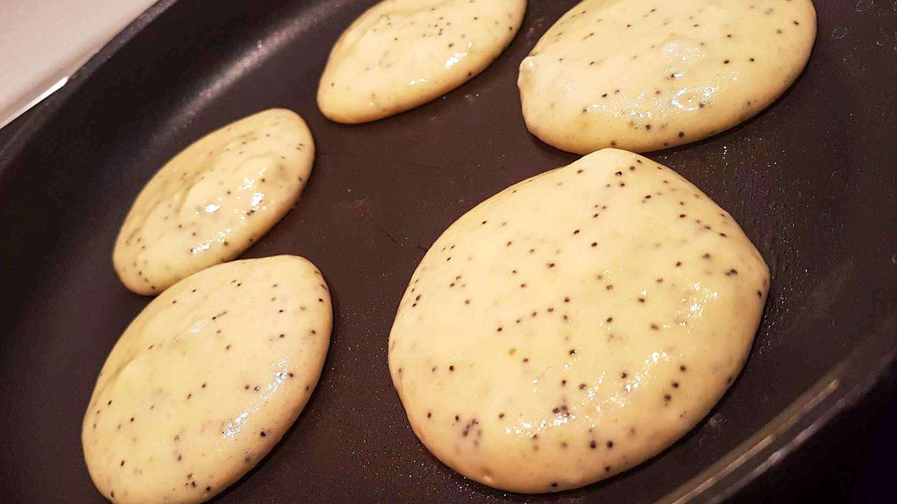 Ungi una padella antiaderente con un po d’olio, passa un pezzo di carta assorbente su tutta la superfice per ungerla completamente e cuoci i pancake fino a doratura. Bastano circa 45 secondi per lato a fiamma media perchè siano cotti.
