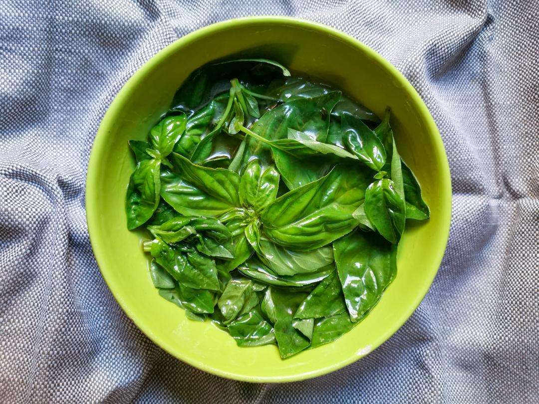 Un altra fonte di ossigeno da evitare categoricamente è l’acqua, ecco perché è importantissimo asciugare bene le foglie prima di frullare (o pestare) . Io mi aiuto con un canovaccio e un po’ di carta assorbente facendo attenzione a non strofinarle troppo.