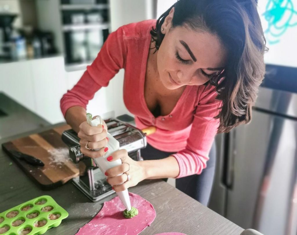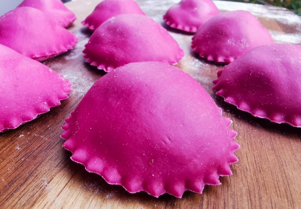 Sigilla bene la sfoglia facendo attenzione a far uscire l’aria. Forma i ravioli aiutandoti con con uno stampo per ravioli tondo o un coppa pasta.