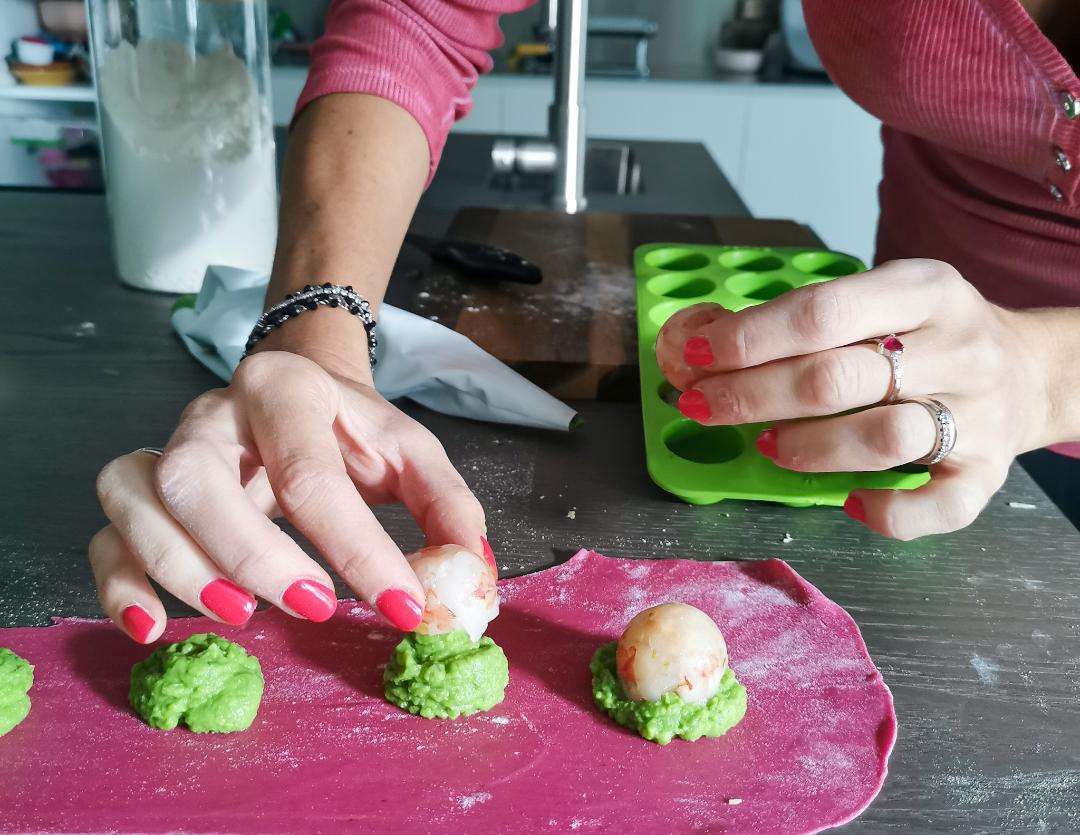 Riponi in freezer lo stampo. Così facendo il cuore del ripieno del raviolo non avrà tempo di cuocersi durante la bollitura. La tartare rimarrà cruda e cremosa.
