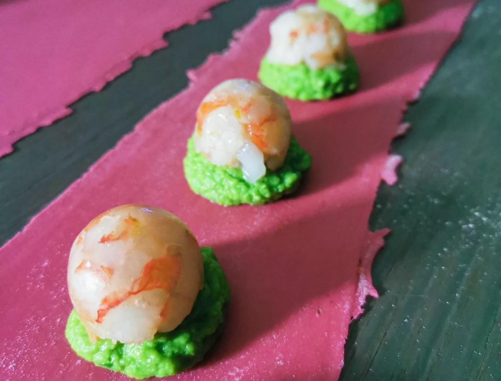 Ravioli rosa, crema di piselli e tartare di gamberi