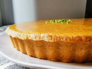 Crostata alle mandorle, crema allo yogurt, gel di cachi