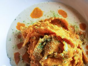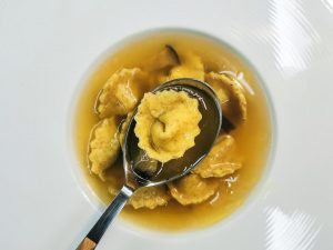 Cappellini integrali ripieni di parmigiano in brodo di miso