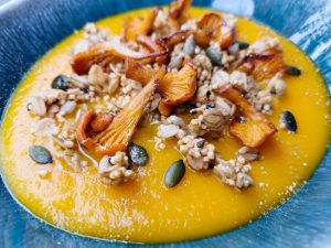 Riso rosso su crema di zucca agrodolce, crudo di gamberi e fico d’india marinato