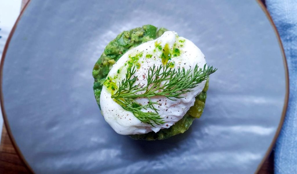 Per l’uovo pochè fai bollire in un pentolino acqua salata con aceto, crea un vortice d’acqua, quando il vortice sta rallentando il suo percorso fai cadere al centro l’uovo aprendolo vicino alla superficie dell’acqua in modo che non tocchi il fondo candendo e l’albume coaguli intorno al tuorlo senza stracciarsi.