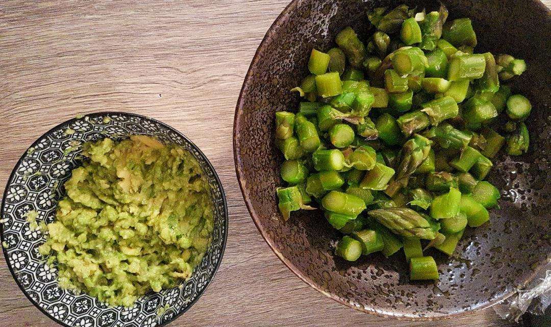 Sminuzza gli asparagi, uniscili alla crema di avocado, amalgama il tutto e impiatta la tartare.